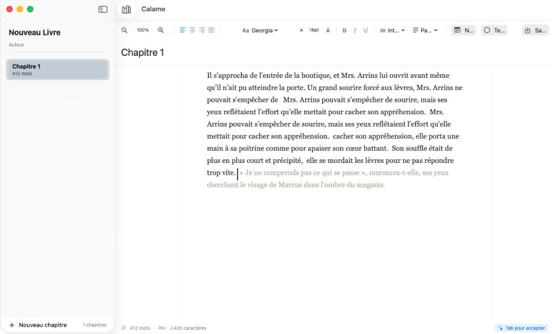 Calame est un éditeur de texte avec autocomplétion IA conçu pour libérer votre créativité. Tout cela sans connexion internet.